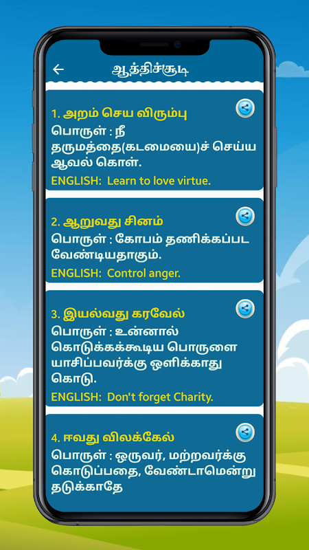 5. Aathichudi (ஆத்திச்சூடி) - Aathichudi è composto da 109 righe di massime create dal grande vecchio poeta tamil Auvaiyar, dove abbiamo fornito il significato di ciascuna sia in tamil che in inglese con l'opzione Condividi.