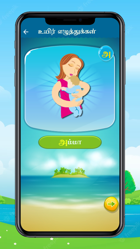 1. Alfabeti Tamil (தமிழ் எழுத்துகள்) – Identificazione degli alfabeti Tamil con insegnamento della pronuncia tramite riproduzione vocale e identificazione tramite immagini. Gli alfabeti tamil contenevano Uyir ezhuthukal, Mei ezhuthukal, UyirMei ezhuthukal e Ayutha ezhuthu. Ogni elemento delle parole tamil aveva la possibilità di visualizzare ogni lettera con un'immagine e una pronuncia delle parole tamil, insegna parole tamil ai tuoi figli.