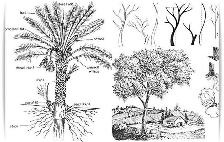 Potrebbero essere grande, alto, piccolo, ombreggiato, appuntiti o arrotondati. In realtà, ogni albero cambia i suoi colori e il carattere a seconda del tempo. Quindi, scegliere l'albero che si desidera illustrare, mentre vi forniamo linee guida di base