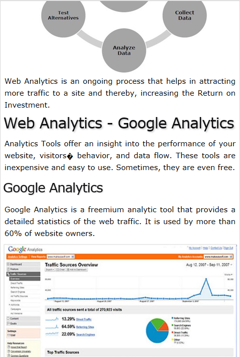 "Web Analytics Quick Guide - Learn Web Analytics in simple and easy steps starting from basic to advanced concepts with examples including Introduction, Google Analytics, Optimizely, Kissmetrics, Crazy Egg, Key Metrics, Data Sources, Segmentation, Dashboards, Conversion, Emerging Analytics, A/B Testing, Automated Reporting and Annotation, Actionable Reporting, Analytics Terminology.
