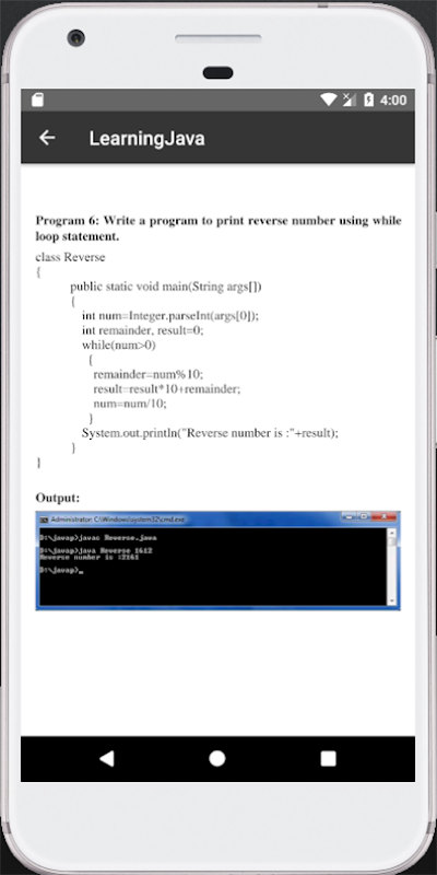 Questa applicazione fornisce tutorial compilati e consolati. Inoltre, fornisce programmi extra e la base di codifica univoca per gli utenti Java, in cui lo studente può scrivere ed eseguire i propri programmi e testare le proprie capacità di programmazione apprese dal discente. I test aiuteranno lo studente a valutare se stesso durante questa applicazione. Inoltre questa applicazione sarà di supporto a chiunque si prepari per interviste aziendali o per l'esame di ammissione tramite domande di intervista fornite in questa applicazione.