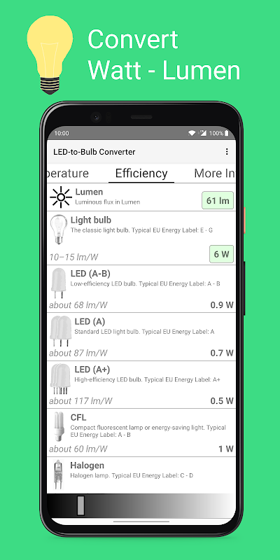 Convertitore da LED a lampadina è un'app gratuita che confronta i valori in Watt di lampade LED, lampadine, lampade fluorescenti compatte (lampade a risparmio energetico) e lampade alogene e la loro luminosità corrispondente tipica in Lumen (lm). L'app ti aiuta a scegliere nuove lampade a LED oa risparmio energetico che sono luminose all'incirca quanto la buona vecchia lampadina.