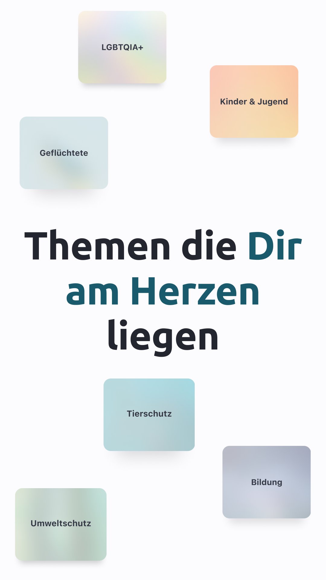 Il tuo sostegno può essere di grande aiuto in un'ampia varietà di aree: nella nostra app troverai progetti che lavorano per la protezione dell'ambiente e la conservazione della natura, rifugiati, bambini e giovani, benessere degli animali e molte altre aree che vale la pena sostenere.