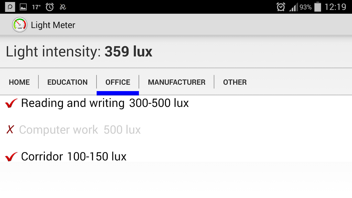 Light Meter è un app che fornisce consigliato gamma intensità della luce per le diverse attività / ambienti e verificare se la luce corrente è adatto per le quali attività / ambienti. Contribuisce a proteggere la vista!
