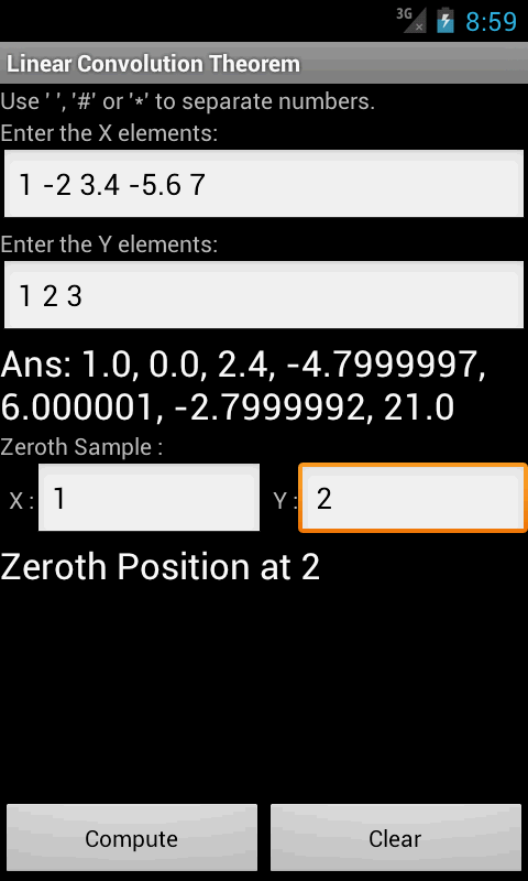 This is an app for those who use the linear convolution theorem. It will directly give you the result of the problem as you enter your X and Y values.