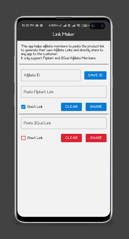 Questa app può aiutare gli utenti di marketing di affiliazione a generare il loro link e condividerli con qualsiasi app dei loro clienti. Non c'è bisogno di andare per il sito web affiliato e cose del genere. Può farti risparmiare un sacco di tempo. Ragazzi, spero che vi piaccia : )