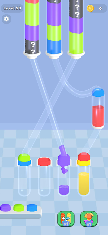 Elimina tutte le bottiglie per completare il livello, ma fai attenzione! Se non riesci a collegare correttamente i tubi, perderai. A volte i tubi si attorcigliano e dovrai districarli prima di poter far scorrere il liquido nelle bottiglie giuste.