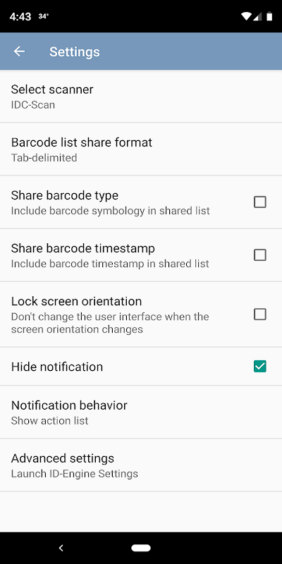 Scanner uses SDG Systems' ID-Engine software for Android that allows you to scan or read barcodes, Bluetooth (BLE) beacons, and UHF RFID tags, with available hardware. The following hardware is currently supported: