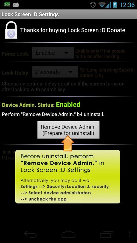 After that, uninstall it in Play Store, in case of error during uninstall in Play Store, Do it at Settings->Apps->Lock Screen :D Donate-->Uninstall