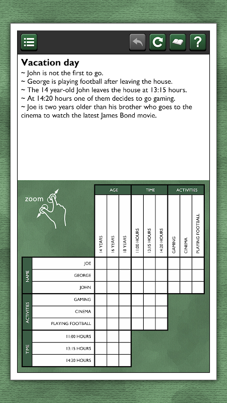 Decodifica gli indizi scritti e usa la griglia per segnare una relazione tra due elementi ed eliminare le altre possibilità e risolvere il puzzle.