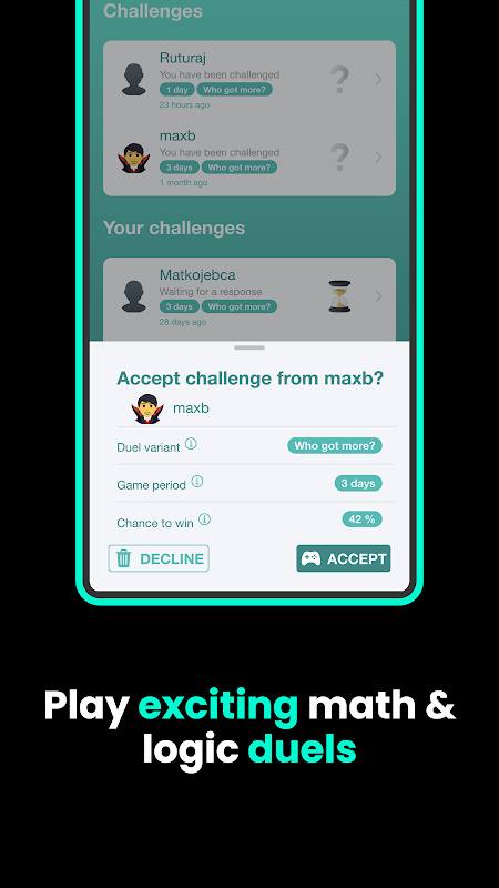 Gioco online: duelli di matematica e logica contro giocatori reali, gameplay basato su round, filtro per paese (il tuo paese o il mondo intero), classifica e punti, chat e reazioni, avversari imparziali grazie al posizionamento automatico delle abilità.