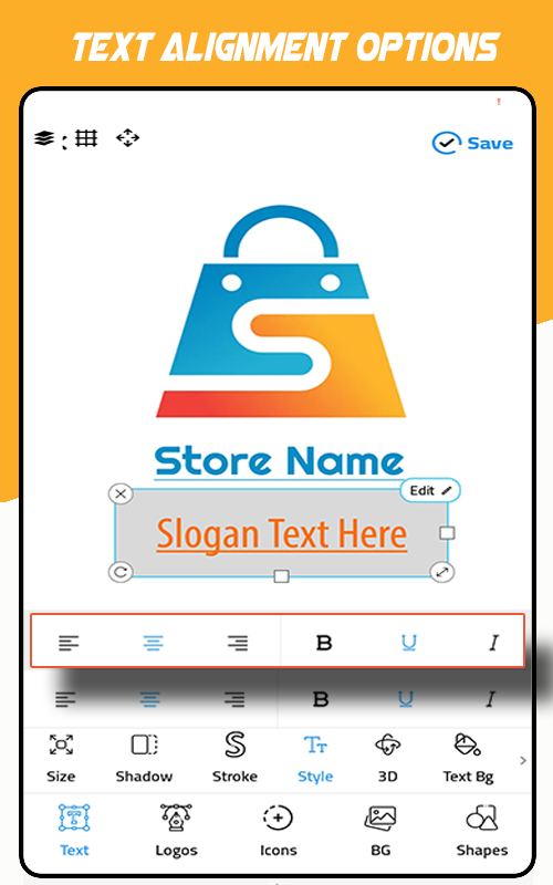 Logo Maker fornisce anche strumenti di fotoritocco e modifica del testo professionali come: Capovolgi, Ruota, Ruota 3D, Ridimensiona, Curva, Carattere, Colore, Tonalità e molto altro di cui avrai bisogno per creare splendidi loghi originali.