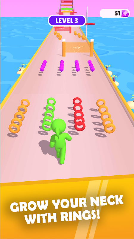 Long Stack Neck Run 3D è fluido, basta controllare il tuo personaggio con il dito. Con i tuoi riflessi ottieni più anelli che puoi dai tuoi colori per far crescere il tuo collo in Long Neck Run 3D. Ottieni più bonus e sblocca tante meraviglie in Long Neck Run 3D. Ma fa attenzione! Ogni anello del colore sbagliato ti farà perdere parte del collo e potresti non cadere in mare. Tieni la testa alta.