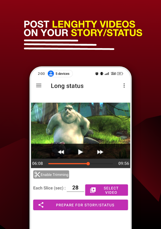 Scarica subito Long Video Status & Trimmer e amplia il tuo stato, dividi i tuoi video e condividi storie illimitate sulle tue piattaforme social preferite!