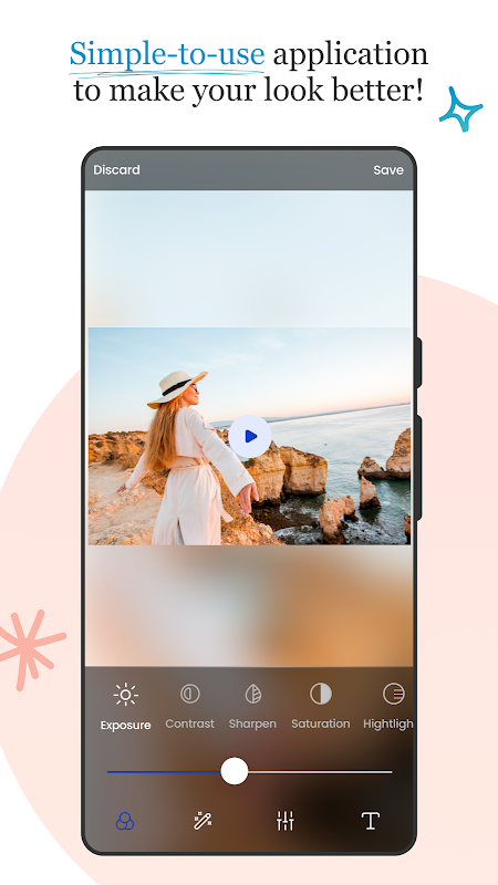 Aggiungi facilmente testi, regola contrasto, esposizione, luci, nitidezza e saturazione su foto e video. L'interfaccia utente semplice e chiara rende il processo creativo così facile e divertente.