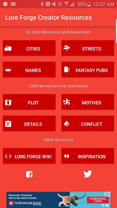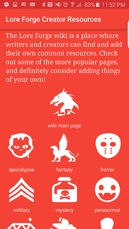 Finally, the app contains links to each writing genre's portal on the Lore Forge Wiki, in case you need more information, lists, or content.