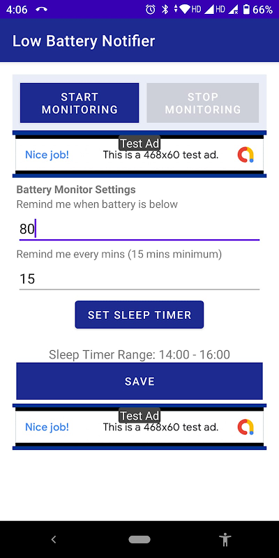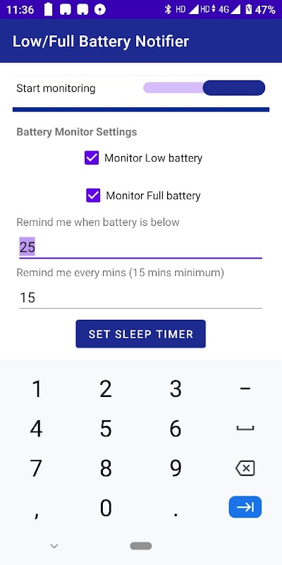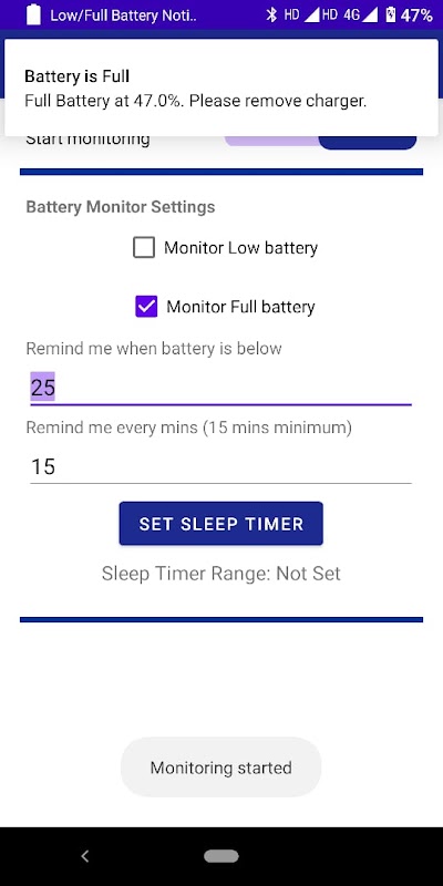 Low/Full Battery Notifier è un'app ricca di funzionalità che fornisce il monitoraggio della batteria scarica/carica con avvisi sonori. Ricevi una notifica quando il livello della batteria scende al di sotto della soglia definita con le notifiche relative alla percentuale della batteria e gli allarmi relativi alla batteria. Durante la ricarica, quando la batteria è carica, ricevi una notifica con un suono. Imposta intervalli personalizzati per il monitoraggio della batteria e goditi gli avvisi sonori della batteria per assicurarti di non perdere mai una situazione di batteria scarica o sovraccarico. Con la funzione sleep timer, puoi evitare le notifiche durante orari specifici. Scarica ora per una soluzione completa di avviso di batteria e segnalatore di batteria