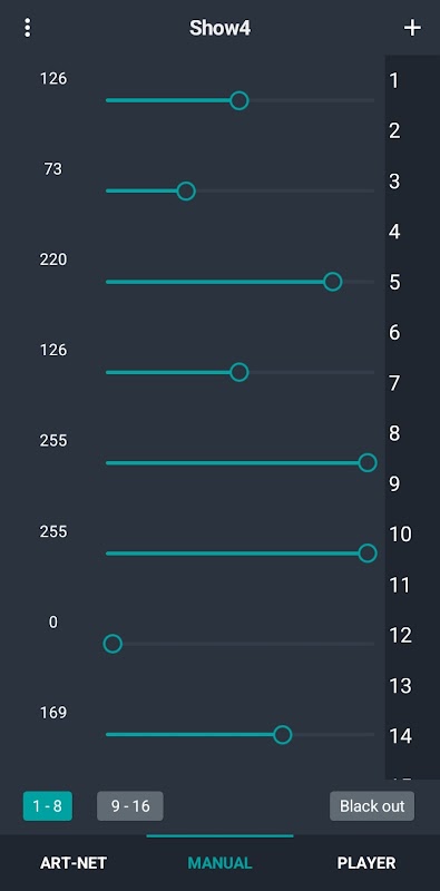 2) Modalità manuale: mostra 8 fader che, insieme alle pagine, consentono di modificare manualmente il valore di 512 canali DMX, questi canali vengono inviati sulla rete in pacchetti ArtDmx;
