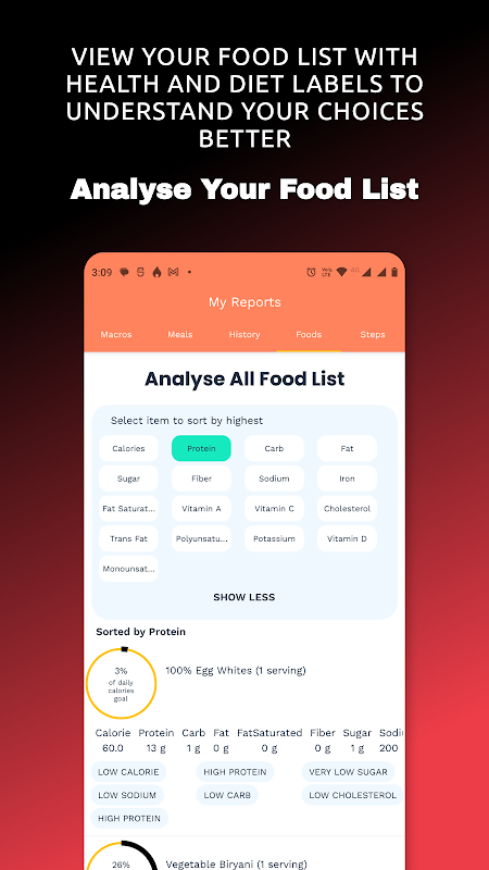 🍱 8. Ordina la tua lista di alimenti in base a nutrienti come proteine, carboidrati e fibre