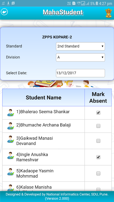 Teachers assigned to a particular standard and division in a school on SARAL portal can register by using MahaStudent mobile App. The Students in catalogue are made available on mobile for submitting daily attendance as well as filling examination marks.
