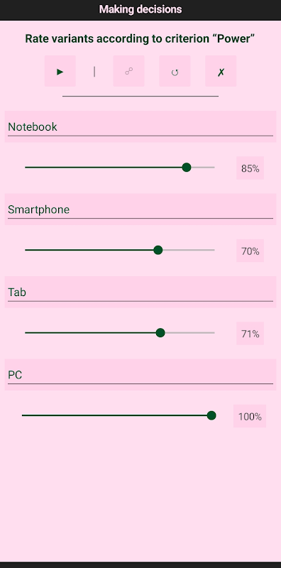 Questa app illustra un metodo matematico che permette di confrontare alcuni oggetti o eventi sulla base di una serie di criteri e di scegliere quello più “corretto”. L'utente è invitato a selezionare autonomamente varianti e criteri per il loro confronto, nonché a specificare il significato di ciascun criterio e ciascun elemento. Di conseguenza, otterrai la risposta alla domanda successiva: "qual è il modo migliore".