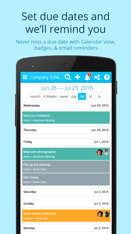 • Visualizzazione calendario: imposta le date di scadenza per le tue attività e visualizzale in formato calendario.