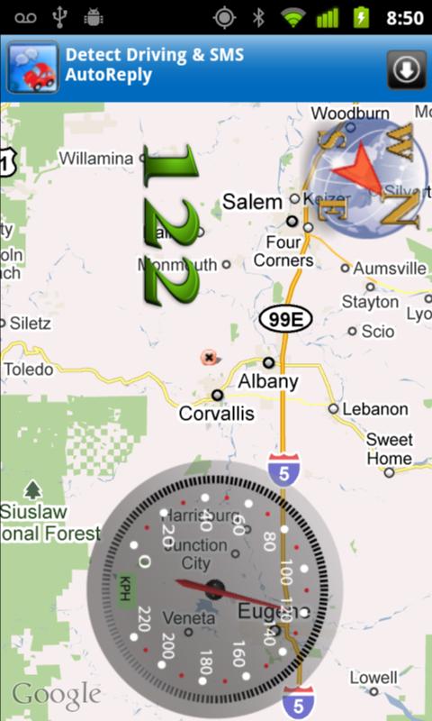 Analog and digital speedometer with a compass on top of a custom Google maps.