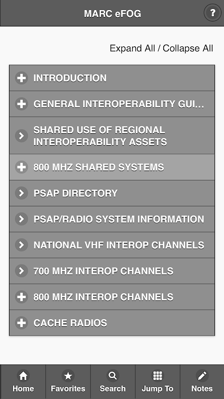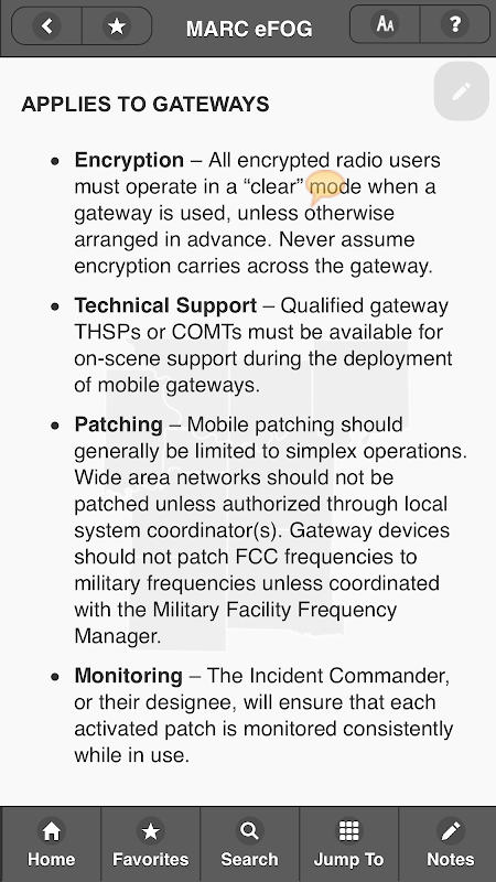 L'app mobile MARC eFOG offre agli utenti un facile accesso alle informazioni sulle comunicazioni di emergenza di pubblica sicurezza, offrendo un indice dei contenuti con collegamenti per passaggi rapidi a sezioni, tabelle, figure o immagini di riferimento. La possibilità di salvare i Preferiti e creare note in linea consente un accesso personalizzato alle informazioni critiche. Il MARC eFOG può essere scaricato e poi portato sul campo come riferimento offline, da utilizzare senza la necessità di una connessione Internet.