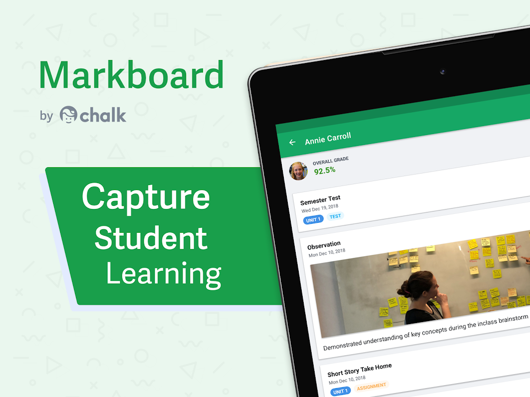 Cattura l'apprendimento degli studenti in movimento con Markboard. Aggiungi foto, video, registrazioni audio e note all'e-portfolio di uno studente. Markboard ti consente anche di visualizzare e modificare i voti direttamente dall'app.
