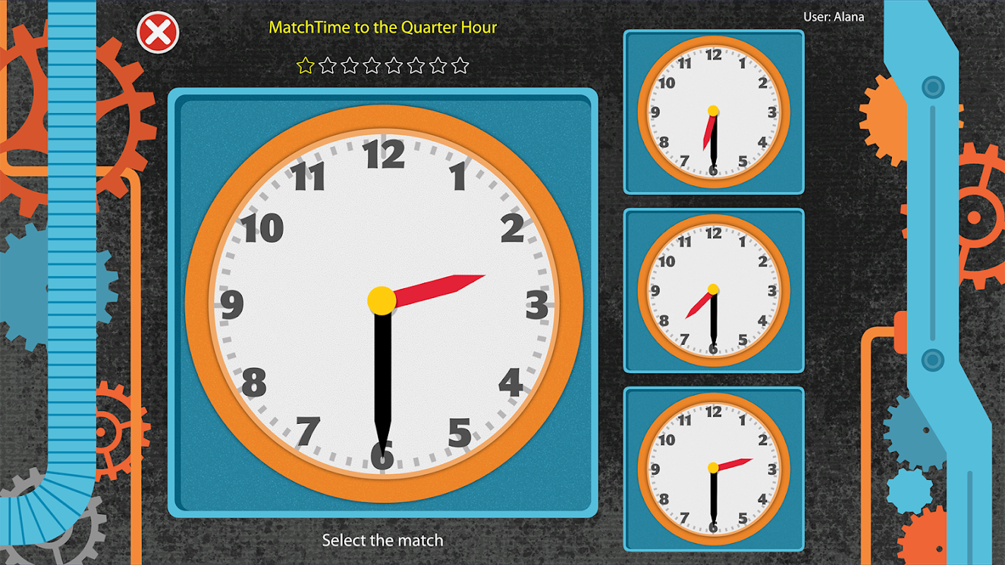 Utilizza sia orologi digitali che analogici. La tenuta di registri estesi tiene traccia dei progressi degli studenti. Il livello 1 si concentra sulla corrispondenza della lancetta delle ore, mentre il livello 2 introduce intervalli di 15 minuti. Il livello 3 fornisce esercizi che utilizzano tutti i minuti e il livello 4 avanza fino a quattro ore prima o dopo rispetto al campione.