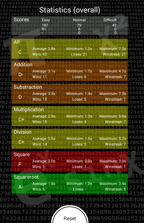 It is proven that "Mental Calculation" can be exercised to achieve higher accuracy and performance. Math Brain Free is a mental workout application that tests and exercises your skills in solving simple arithmetical calculations. You face a calculation with 3 possible solutions, solve and find the right answer in 10 seconds. Points and grade depend on time taken and mistakes done.