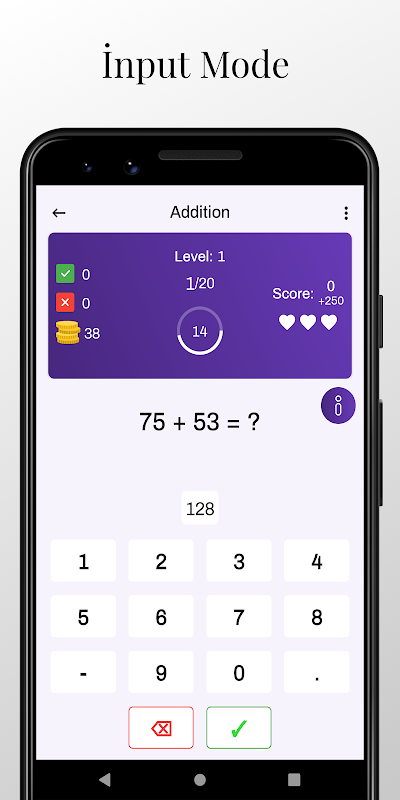 Input Mode: In this mode of the application, the question is asked to you, and you determine the answer by yourself, without any option. When you find the correct answer, you send the answer by pressing the confirm button. You have 1 hint right in this mode. Pressing the hint button gives you the correct answer to a question. There are 20 questions. You have 30 seconds for each question.