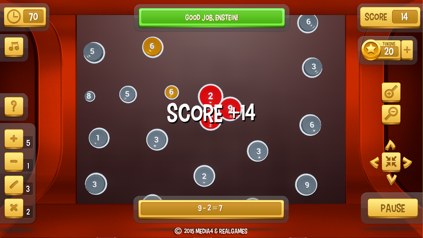 Touch numbers and choose the operations to solve a given number that is displayed in a red circle. Simple rules, and great casual gameplay. The number in the red circle is the one you should try to reach by using limited number of operations and available numbers. The trick is that all of the selected circles must be bordering, and the last selected has to be bordering with the red one. More solutions you have, more points you will get!