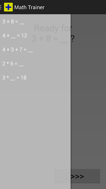 The Math Trainer shows you simple calculation exercies which you should solve as fast as possible. The elapsed time is measured automatically. Your slowest results will be improved in the following training session.