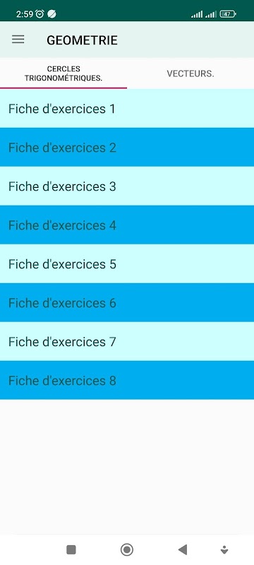 applicazione di esercizi di matematica per la seconda classe dedicata alla parte del programma di matematica. Esercizi di geometria con correzione sui vettori e sul cerchio trigonometrico. Per i vettori, l'obiettivo degli esercizi è imparare a leggere le coordinate di un vettore, a calcolare la norma di un vettore e ad eseguire operazioni sui vettori. Per gli esercizi sul cerchio trigonometrico, l'obiettivo è imparare a determinare le misure degli angoli in gradi o in radianti, eseguire conversioni e leggere sul cerchio trigonometrico. Gli esercizi sulle funzioni riguardano principalmente le tabelle di variazione delle funzioni, la rappresentazione grafica delle funzioni, la ricerca degli estremi e il confronto delle immagini dalla tabella di variazione