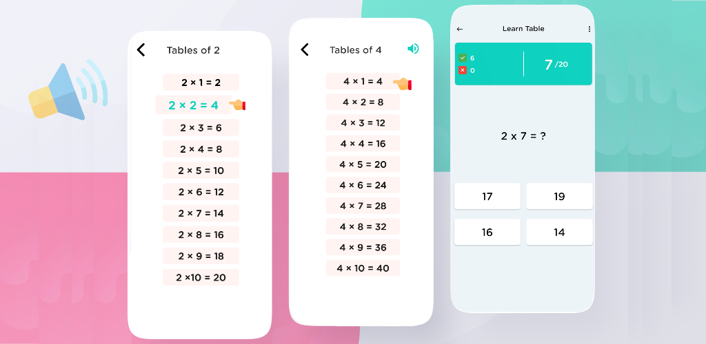 Math tables from 1 to 100 have been added, just select one table and 10 or 20 multiples will be shown and audio will be played to make learning quicker.