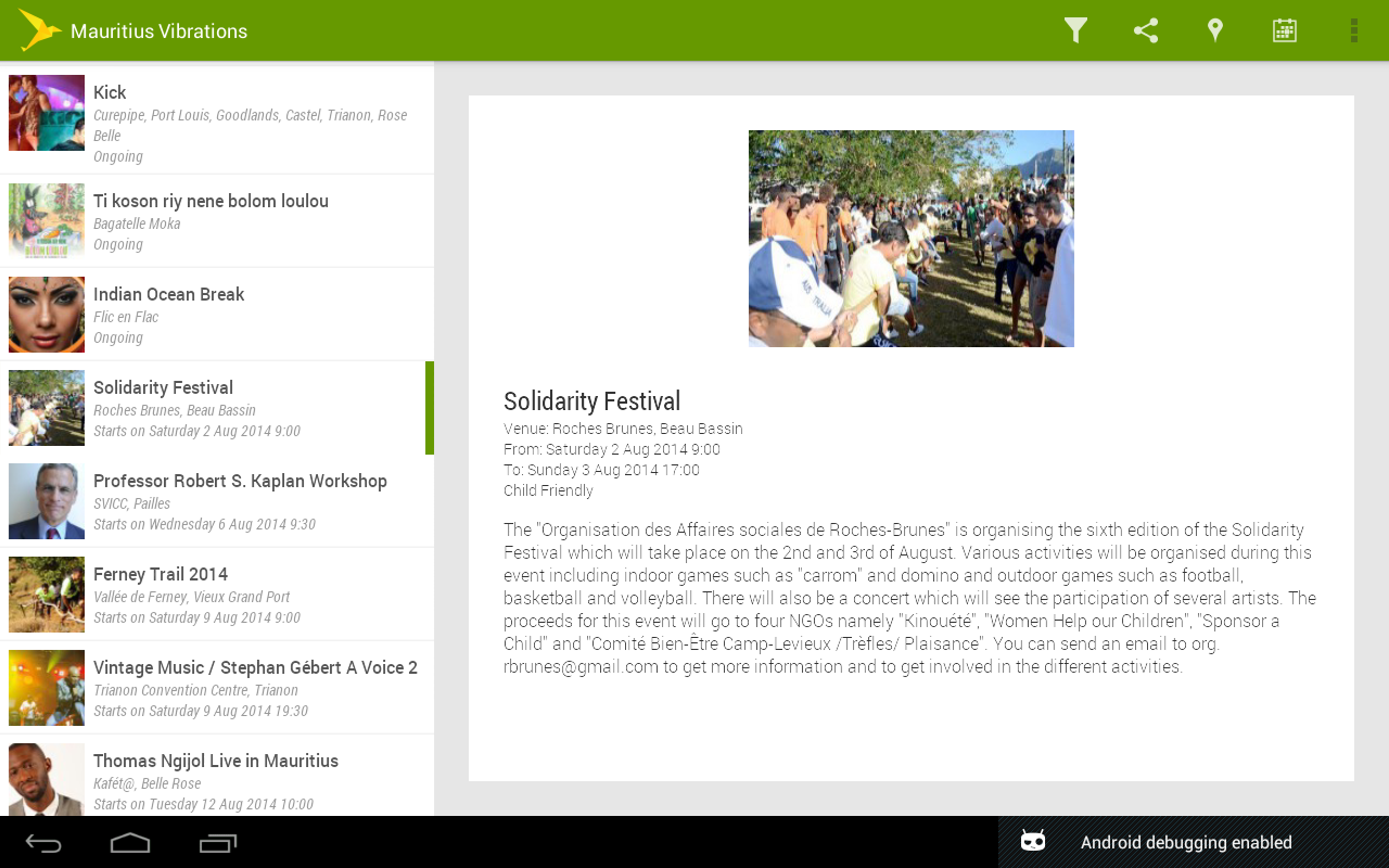 Event organisers can easily send details of their events to be featured in Mauritius Vibrations. This can be done from the application itself or by sending an email to [email protected]