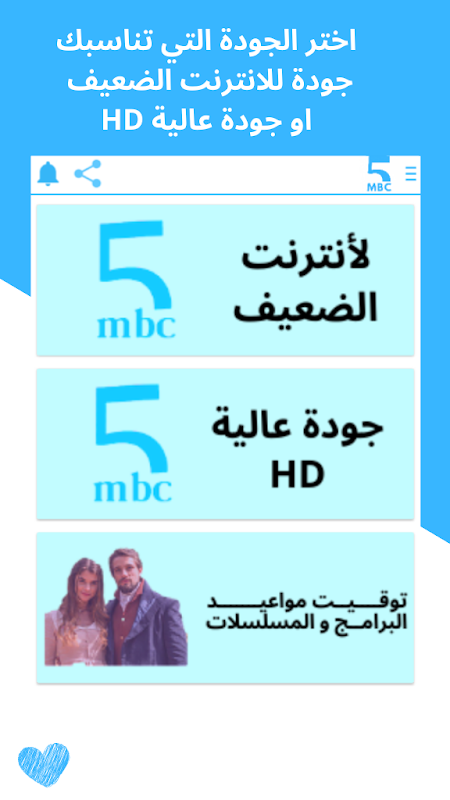 Guarda la trasmissione in diretta di MBC 5 senza interruzioni e ovunque tu sia, trasmissioni in diretta dei film e delle serie arabe e internazionali più famose e le ultime esclusive del mese di Ramadan. L'applicazione MBC 5 LIVE offre il piacere di trasmettere scegliendo la qualità che fa per te, Internet debole o alta qualità.