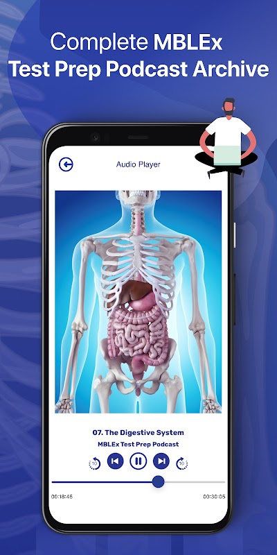 Il contenuto gratuito include 100 domande di prova pratica che coprono massoterapia, anatomia e fisiologia, patologia e kinesiologia, una domanda gratuita del giorno e una selezione di episodi dal podcast di preparazione al test MBLEx!