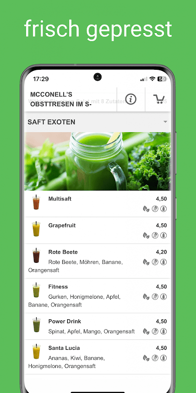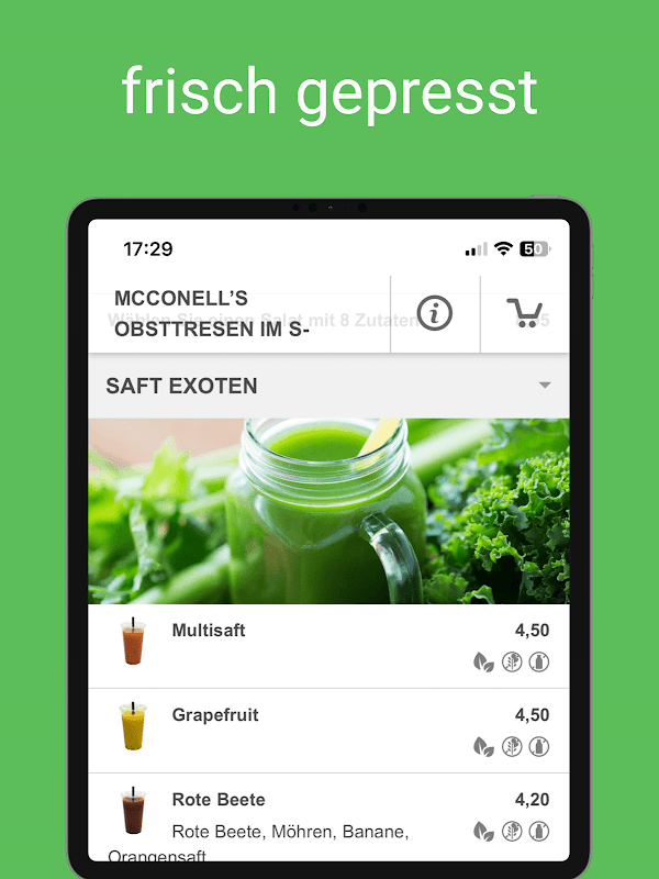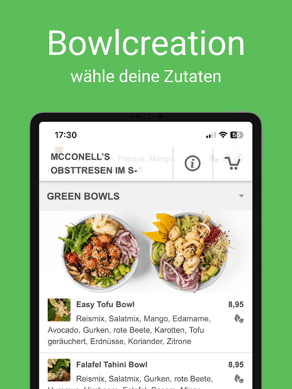 Scatena la tua immaginazione e crea il tuo mix di insalata dalla nostra vasta gamma di oltre 60 ingredienti. Scegli tra un'ampia varietà di insalate e verdure, vari altri deliziosi ingredienti e i nostri gustosi condimenti. Le insalate sono adatte sia per uno spuntino salutare tra un pasto che per un pasto vero e genuino. McConell's Obsttresen offre anche un'ampia selezione di ingredienti freschi per vegetariani e vegani. I nostri dipendenti saranno lieti di consigliarvi sulla composizione. In pochi passaggi puoi creare un'insalata ricca di vitamine secondo le tue idee e gustarla subito