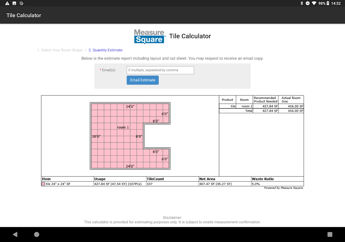 Misurare Piazza Calcolatrice Tile, un diagramma di layout tegola professionale e stima qty. Si stima sulla base di formati di piastrelle, divario stucco, e punto di partenza di layout e genera un rapporto di stima con il numero di pezzi necessari, il rapporto rifiuti, superficie netta e così via, e uno schema esatto layout.