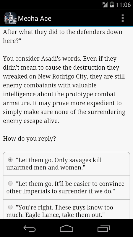 "Mecha Ace" è un emozionante interattivo romanzo di fantascienza di Paul Wang, dove le scelte controllano la storia. Il gioco è interamente basato su testo - senza grafica o effetti sonori - e alimentato dalla grande, potere inarrestabile della vostra immaginazione.