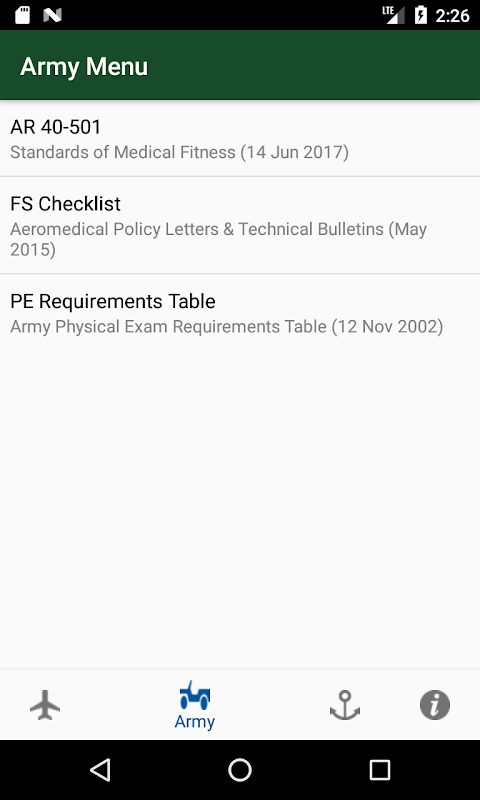 Questa applicazione presenta gli standard medici per il personale di servizio speciale dell'Aeronautica, dell'Esercito e della Marina degli Stati Uniti, nonché altri strumenti e informazioni utili per i professionisti della medicina aerospaziale.