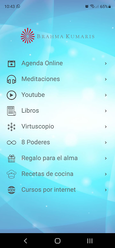 Applicazione gratuita Brahma Kumaris senza pubblicità in cui le persone possono consultare l'agenda delle attività gratuite dell'organizzazione faccia a faccia o online allo stesso tempo che possono utilizzare più di 20 CD di meditazione online e scaricare libri sulla spiritualità gratuitamente. Allo stesso tempo contiene due attività di intrattenimento educativo chiamate Virtuscope e 9 Powers dove le persone possono giocare e allo stesso tempo ottenere riflessioni su di esso.