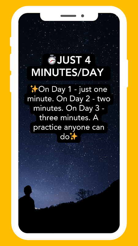 "Meditazione: App per principianti" ti aiuterà a stabilire un'abitudine quotidiana alla meditazione consapevole iniziando con solo 1 minuto al giorno. Il primo giorno inizieremo con solo un minuto di meditazione. Il secondo giorno ci eserciteremo per due minuti, poi il terzo giorno lo estenderemo a tre minuti.