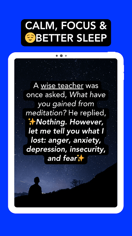 Una volta fu chiesto a un saggio insegnante: "Cosa hai guadagnato dalla meditazione?" Lui rispose: "Niente. Tuttavia, lascia che ti dica cosa ho perso: rabbia, ansia, depressione, insicurezza e paura".