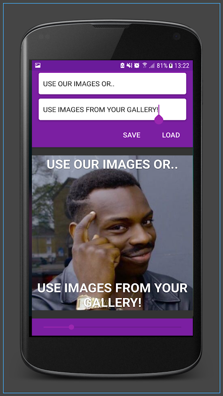 Meme Maker Free gives you the ability to make some awesome memes! You can choose one of our images or use images in your phones gallery!
