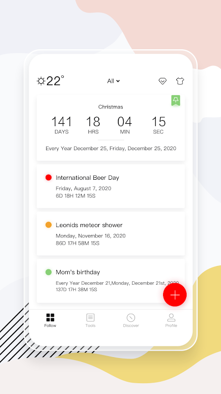 Guarda il conto alla rovescia di tutti gli eventi in tempo reale! Non dimenticare mai ogni giorno importante. Che si tratti del matrimonio di un amico, del compleanno di un bambino o di un anniversario di matrimonio, puoi trovare e gestire il piano nell'elenco delle schermate Timer memoria.