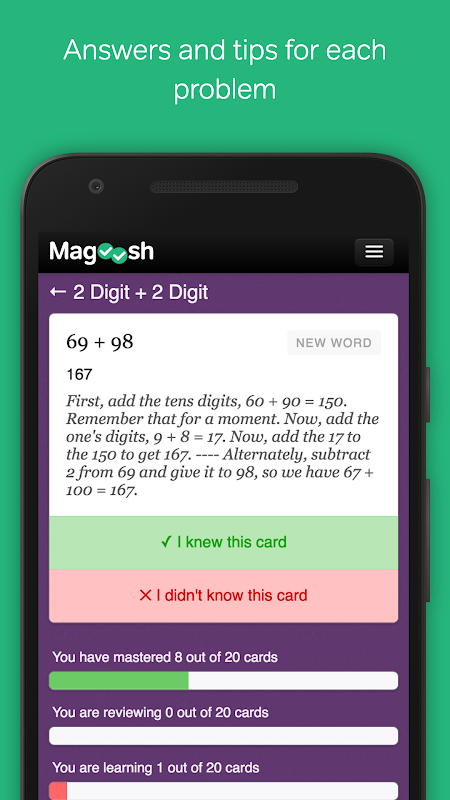 Questa applicazione ti dà libero accesso alla pratica matematica mentale di Magoosh online all'indirizzo https://gre.magoosh.com/flashcards/mental-math. Accedi con un account Magoosh (o crearne uno nuovo) per salvare i tuoi progressi per il web.