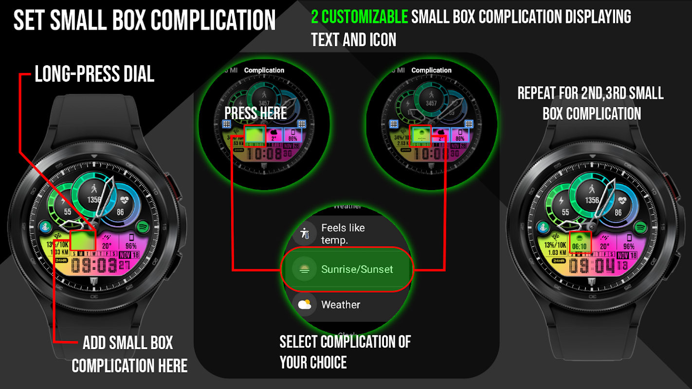 - 3 Small Box Complicazioni personalizzabili che consentono l'aggiunta delle informazioni che si desidera visualizzare. (Testo+Icona).